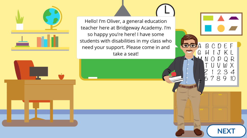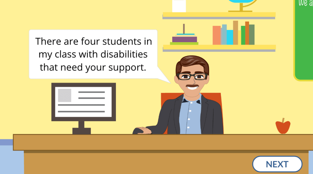 This scenario-based elearning experience helps teachers and advisors make appropriate accommodations for students with disabilities. It provides teachers an effective framework for supporting students with disabilities in the classroom and it provides valuable insight for advisors to support the parents of these students. With teachers and advisors making the appropriate accommodations for these students with disabilities it will increase student engagement, student progress, and make an overall more positive learning experience.
